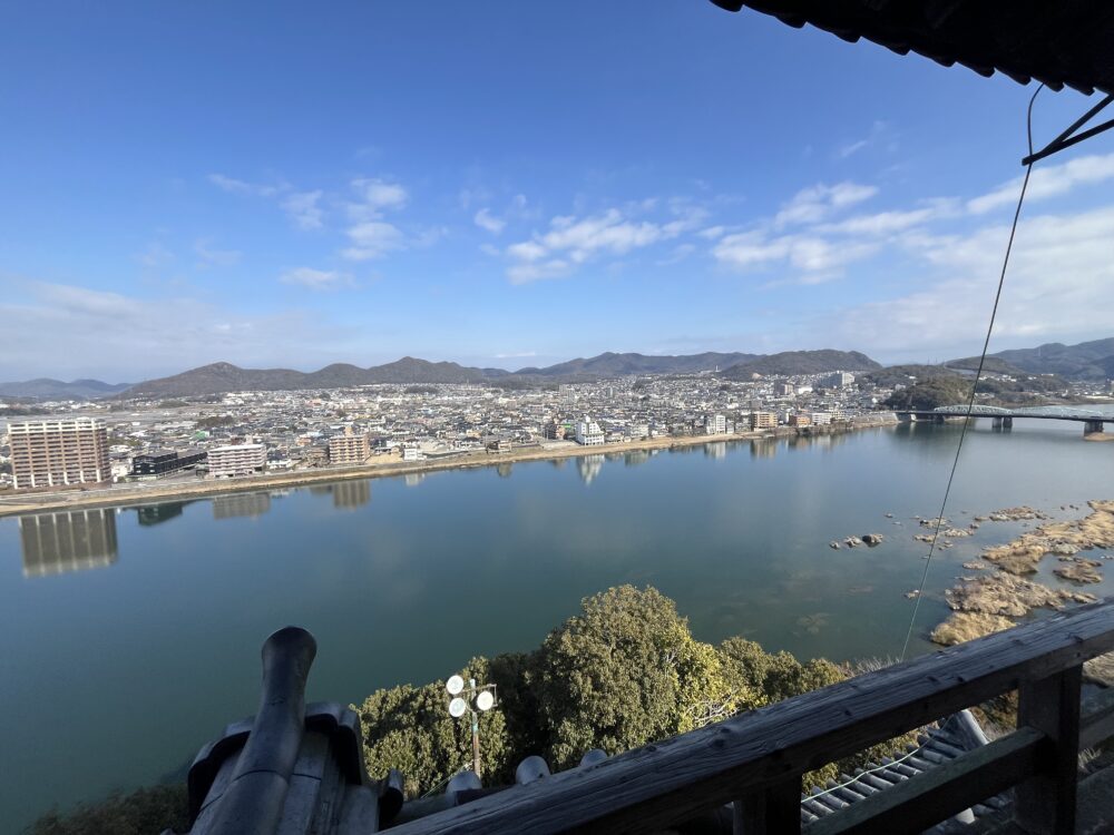 ▼犬山城は北側を流れる木曽川と断崖絶壁を背後に配した「後ろ堅固」の城。対岸(画面右中央あたり)に見える岩山には、室町時代から安土桃山時代まで鵜沼城が建っていたそう。(2026年2月撮影)